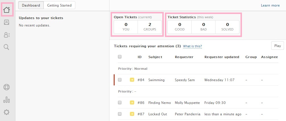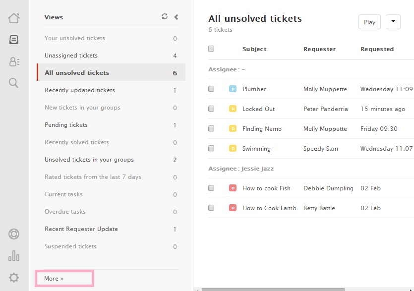 While these views cannot be customised, they do provide ticket details to all agents. To access the default views, click the home button on the sidebar.