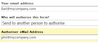 When another user is to authorise the form, an additional authoriser email address field is displayed.