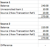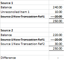 Starting with a balanced reconciliation, all new transaction from the first source are added to the reconciled balance of the second source. All new transactions from second source are added to the reconciled balance of the first source.